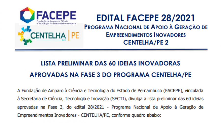 O PROGRAMA NACIONAL DE APOIO À GERAÇÃO DE EMPREENDIMENTOS INOVADORES - CENTELHA/PE 2, lança a lista das propostas aprovadas para criação de Startups, sendo a YEAST BEERTECH - coordenada pelo Prof. Vitor Lima, uma das classificadas.